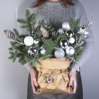 Ёлочка ручной сборки из голубой датской ели Nobilis. Украшена новогодними игрушками в серебряной гамме.